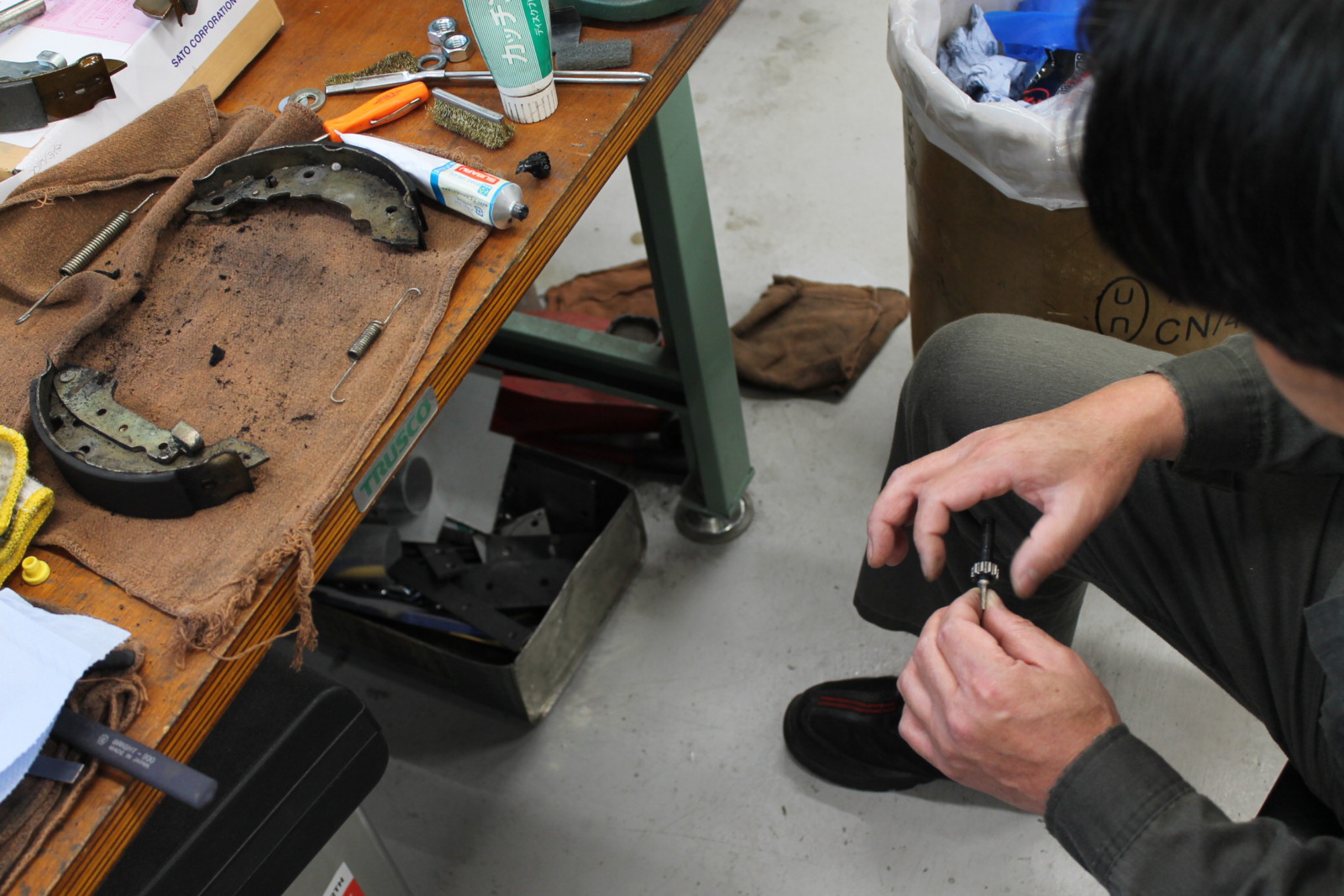 Mメカ~モノミッレは部品待ちでサンクのブレーキ作業中。