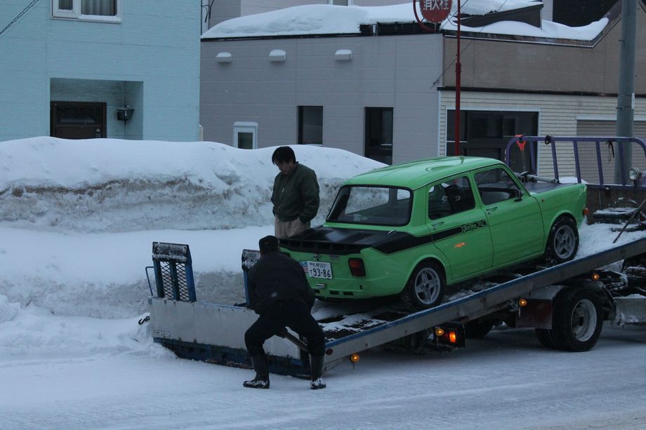 積載車に載せる時は少し吹雪も納まっていました^^
