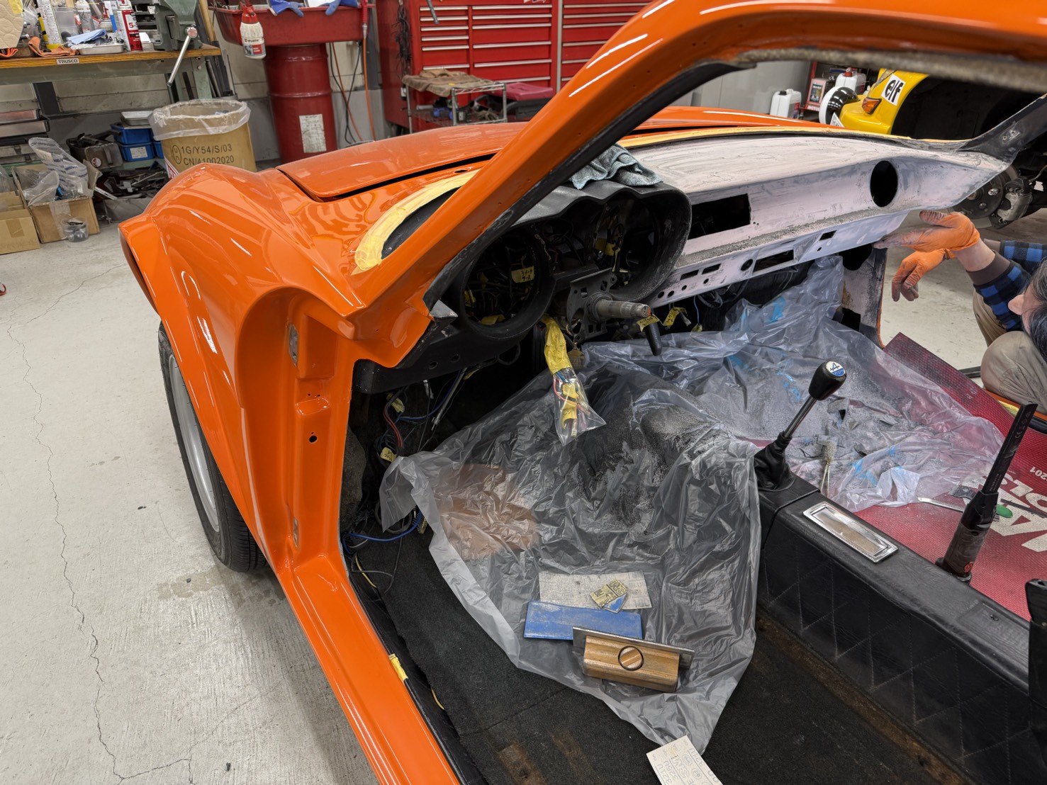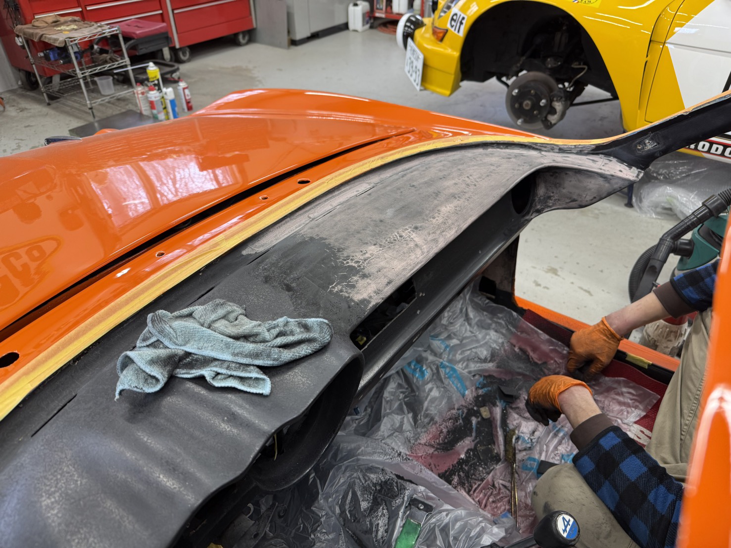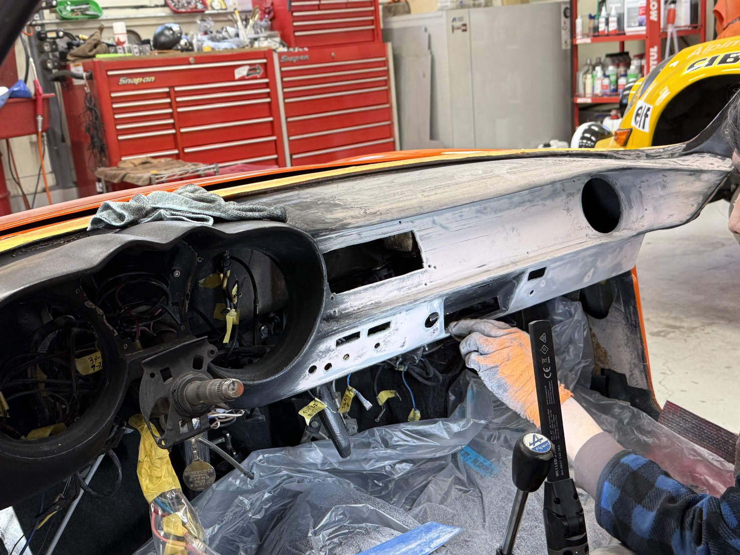ダッシュボードの作業、過去に塗装をされていてパラパラと剥がれるところもあるので
