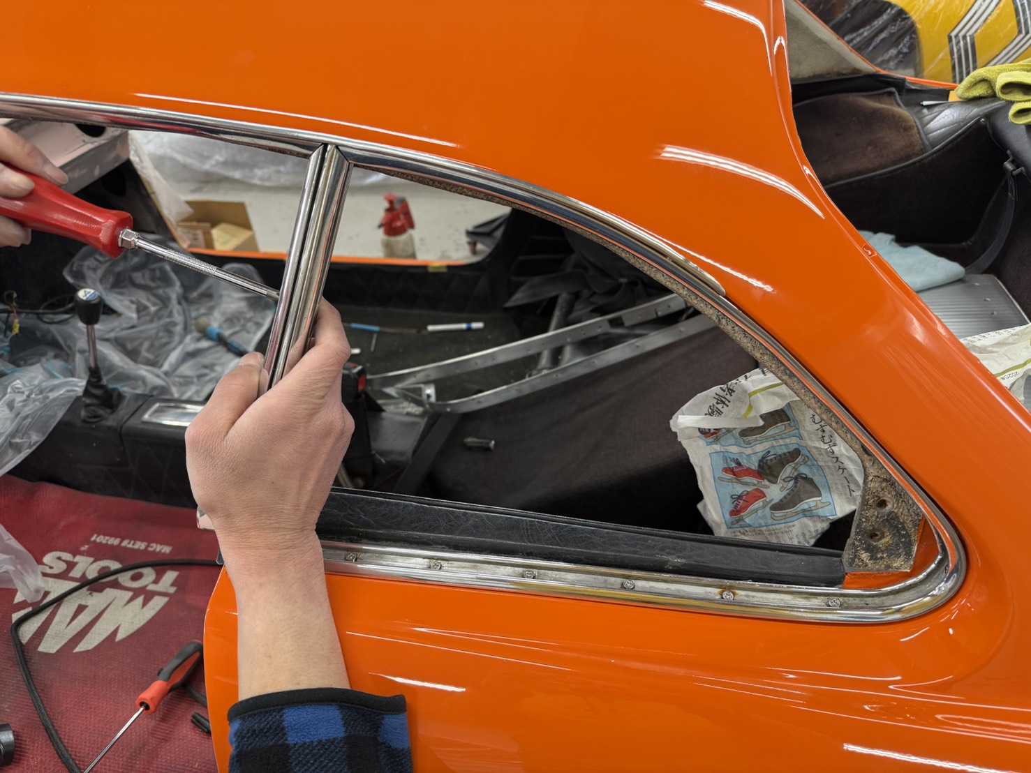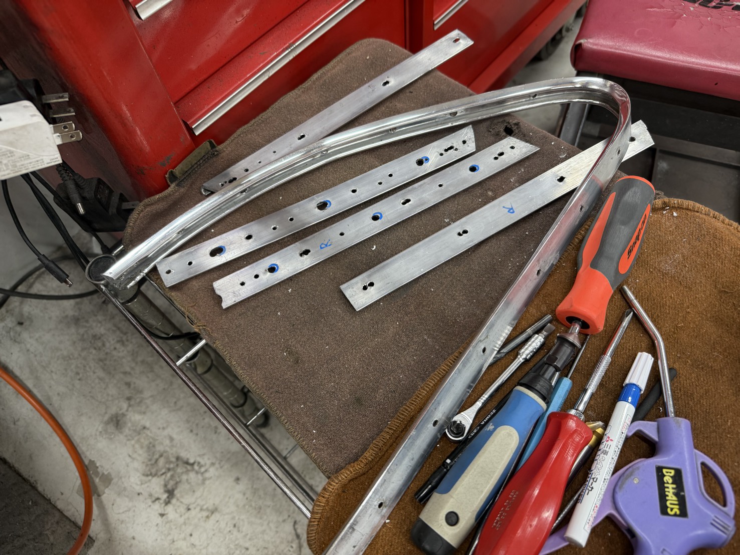 クオーターウィンドウの枠や縦のレールなど脱着を繰り返しボディ側の穴加工や